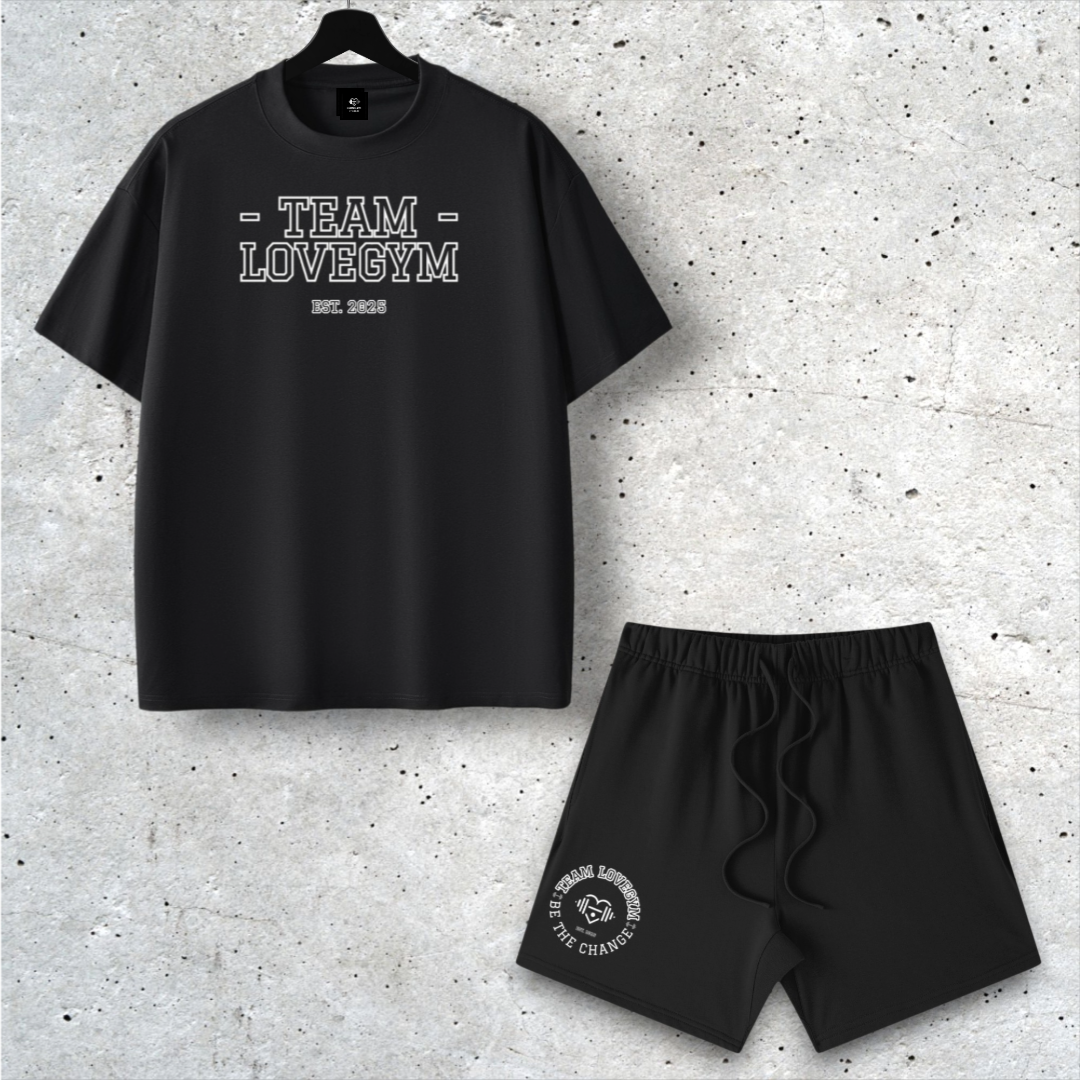 Rep the squad with the ultimate TEAM LOVEGYM set: the Sorona® Oversized Tee and the Heavyweight Cotton Shorts in Black. Bold, breathable, and built for movement — designed to work together from training to downtime.
